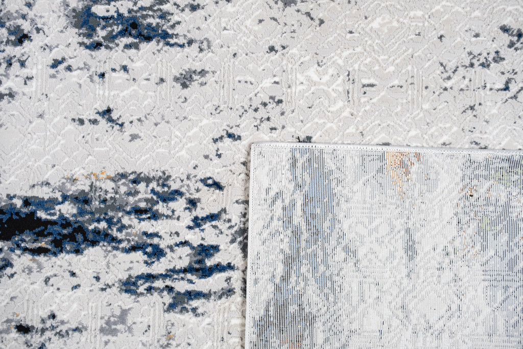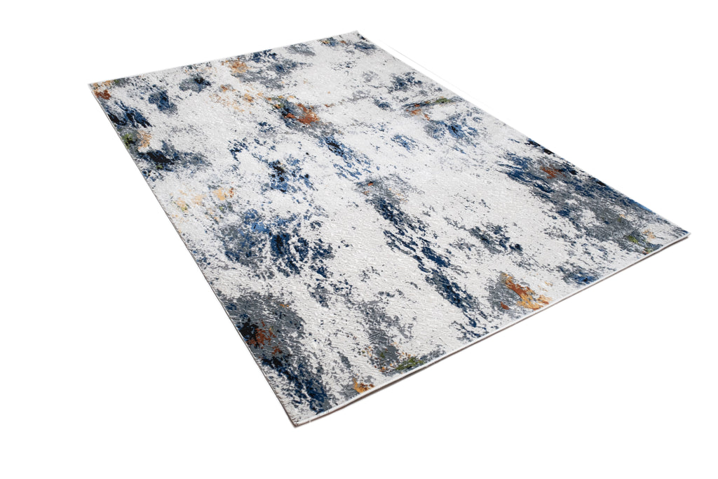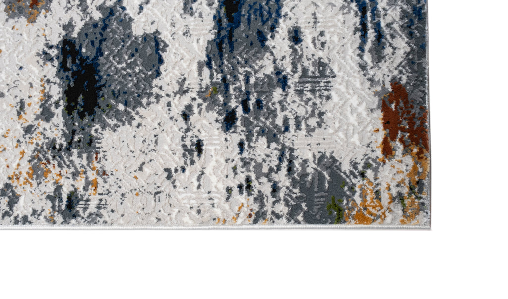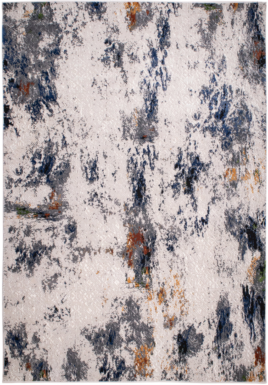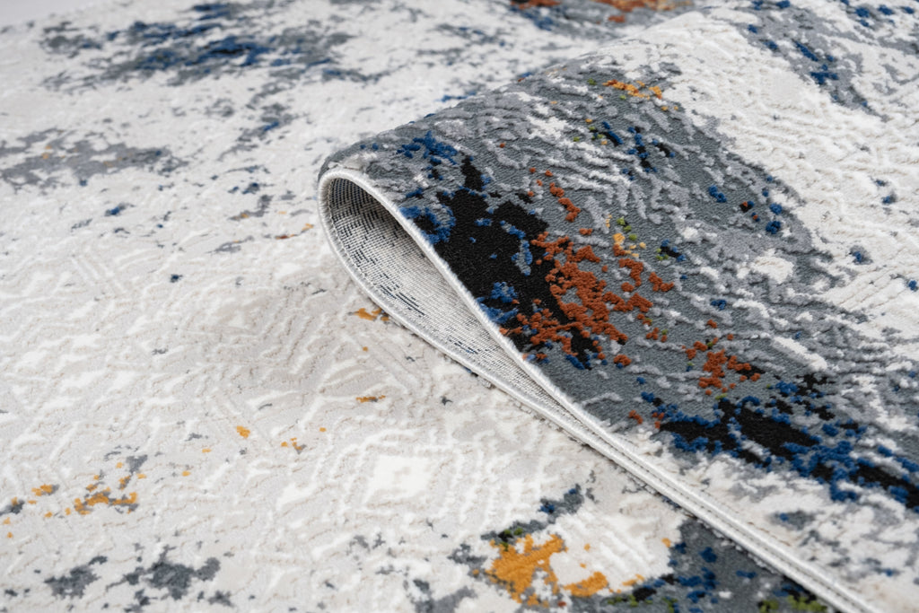 Cream Abstract Rug with Silver, Charcoal, Black, Red-Brown, Mustard, Ocean Blue & Green Accents.