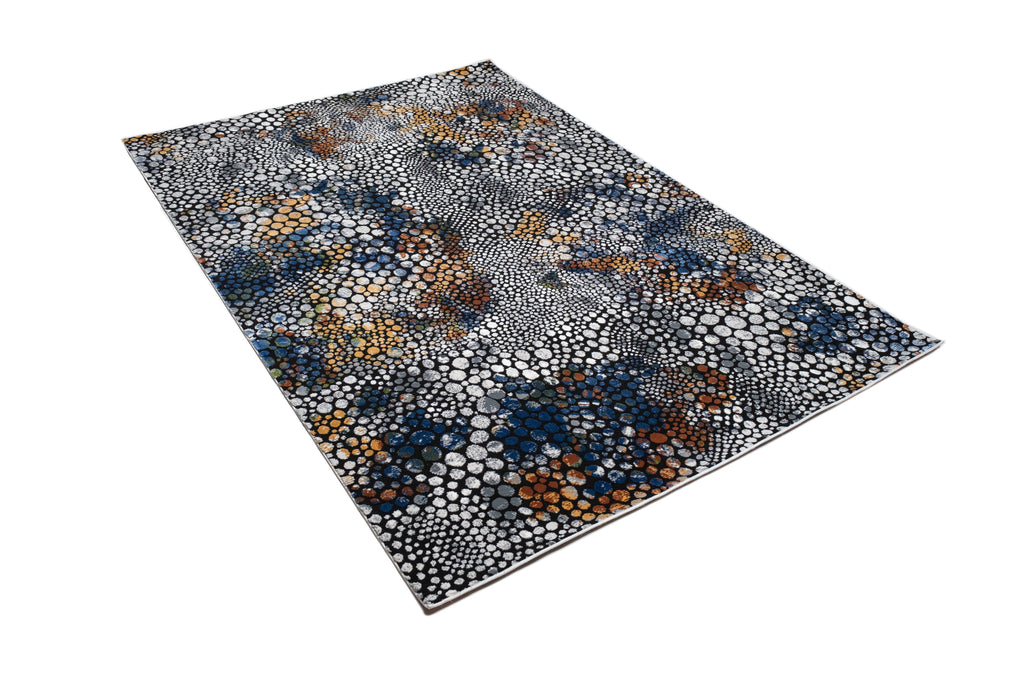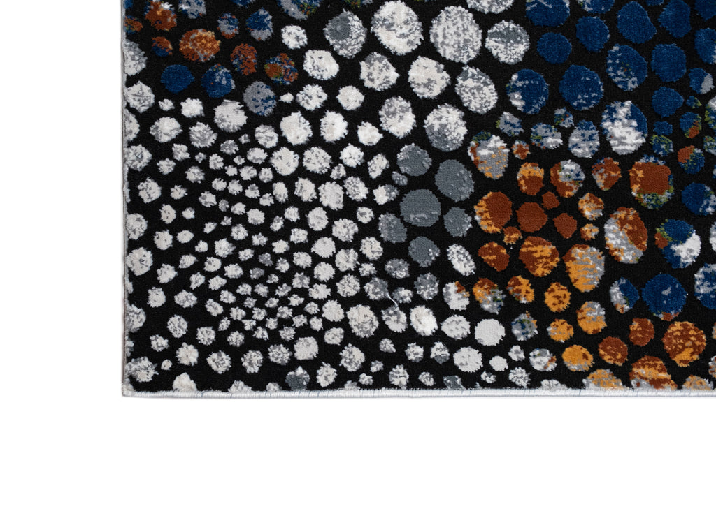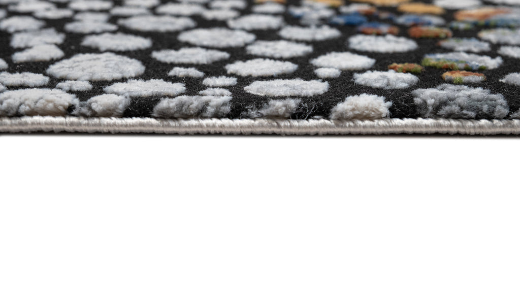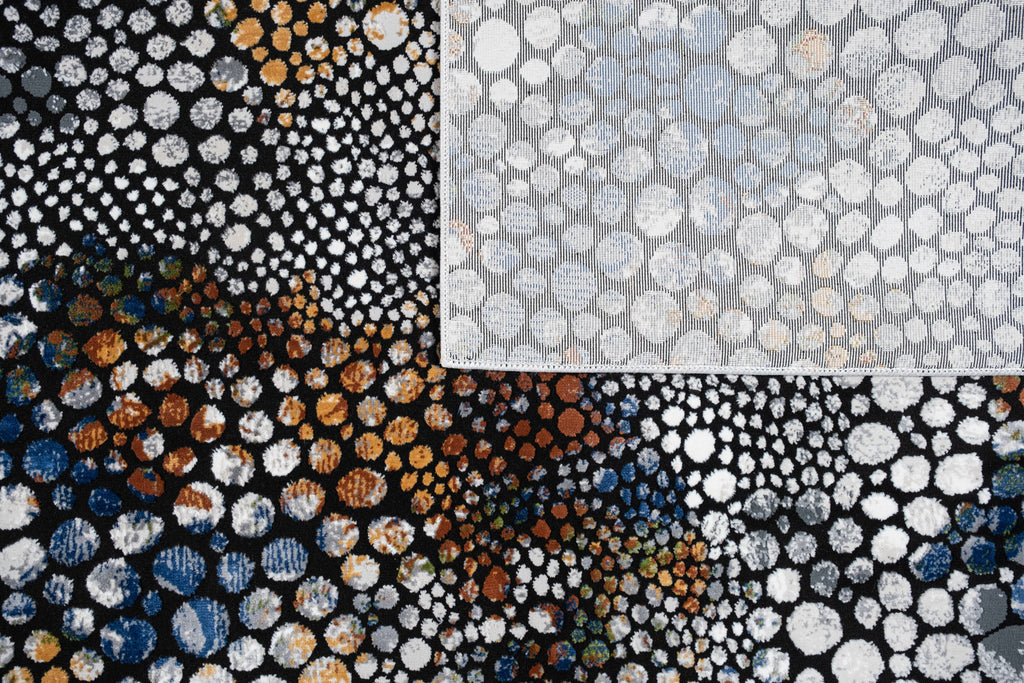 Abstract Spotted Rug – Black with Silver, Charcoal, Red-Brown, Mustard, Green, and Deep Blue Highlights.