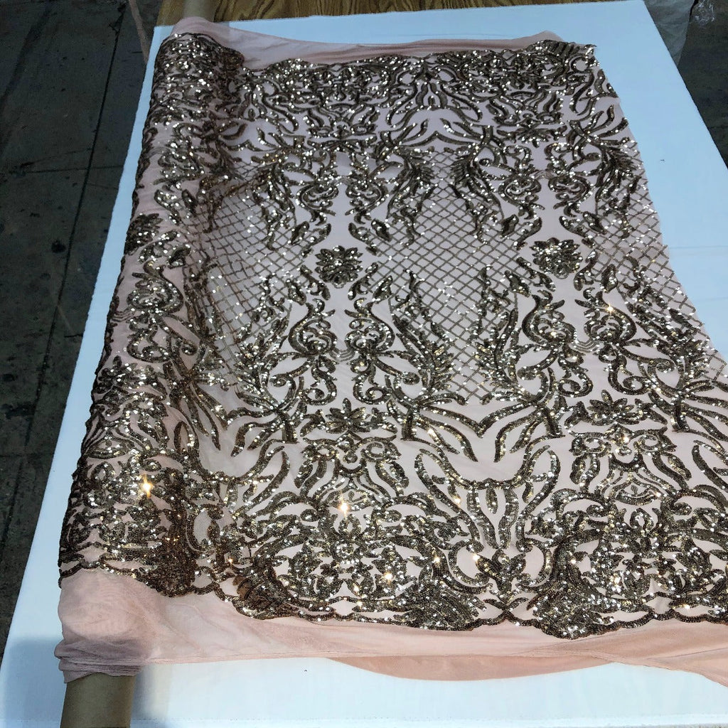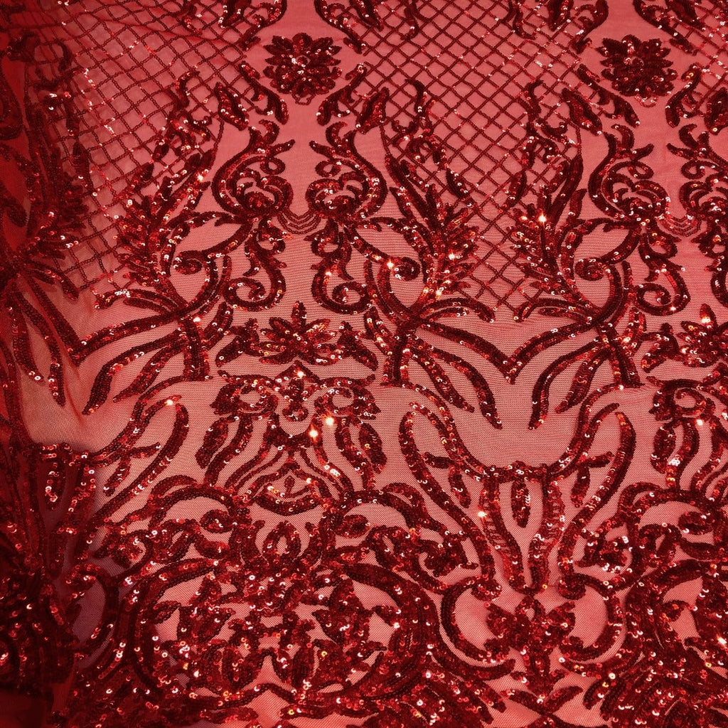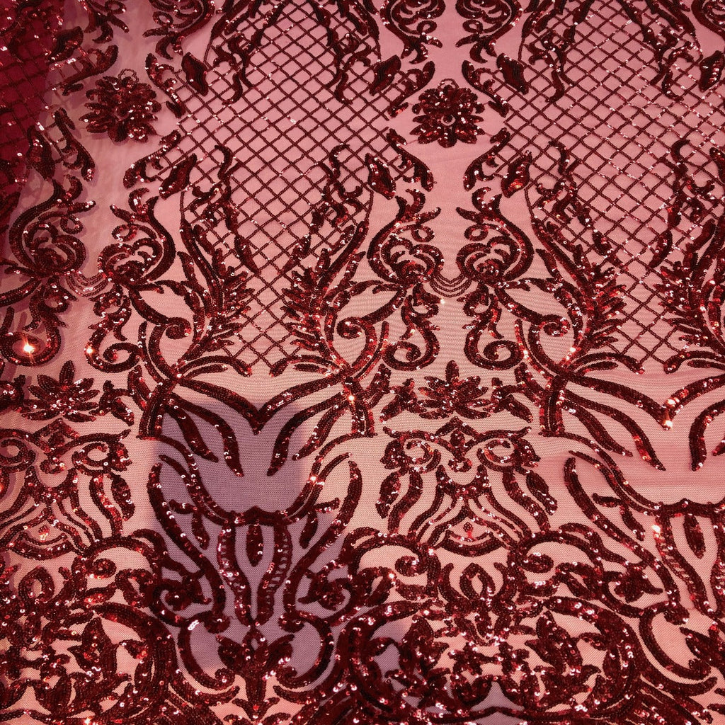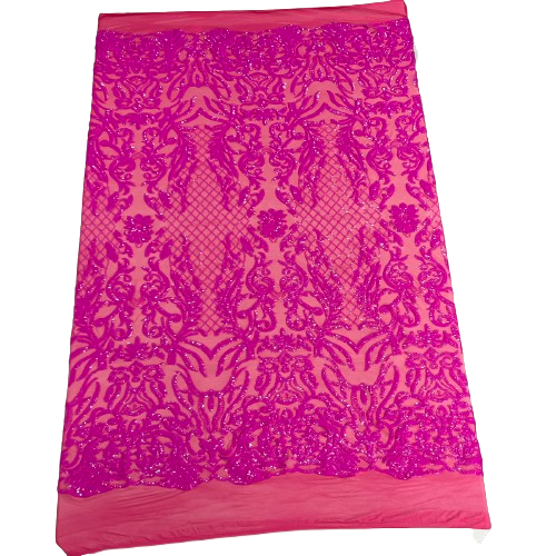 This beautiful and elegant Luna Sequins Lace Fabric is truly one of a kind. Crafted with a luxurious four-way stretch nylon mesh backing, this fabric features a stunning sequin design that captivates and dazzles. Sold by the yard, you can create custom lengths to suit your needs; if more than one yard is purchased, it will arrive as a continuous piece (for example, two yards will be delivered as a 60" x 72" piece).