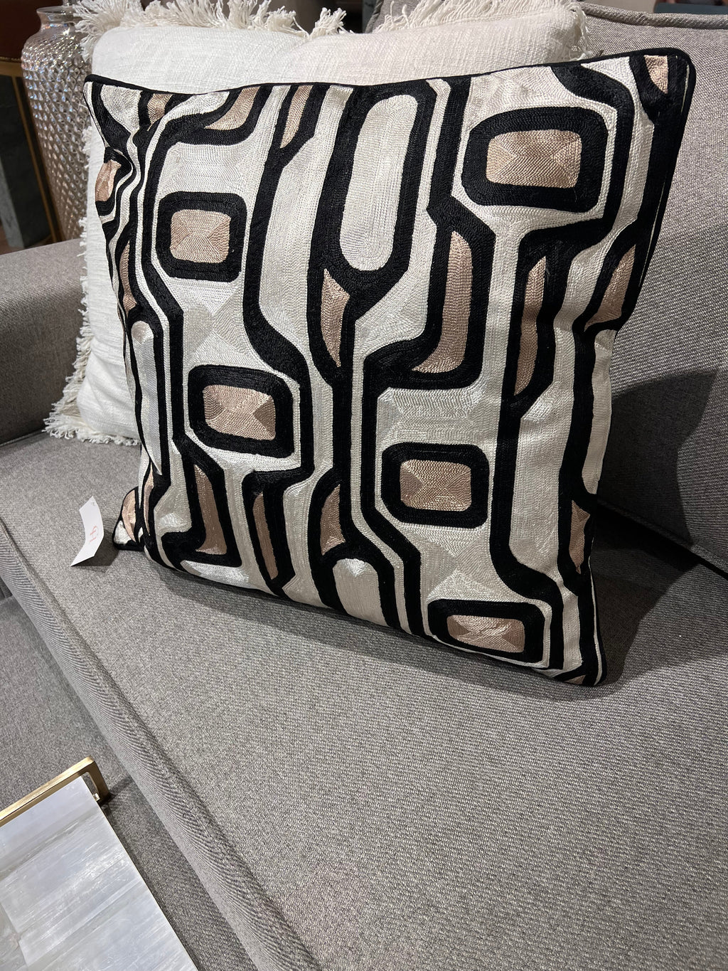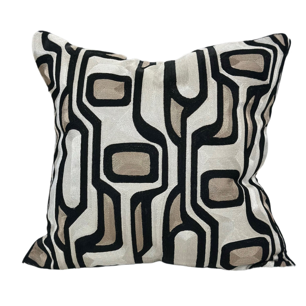 Black Velvet Pillow with Geometric Abstract Embroidery in Ivory, Bronze & Black - SEV004.