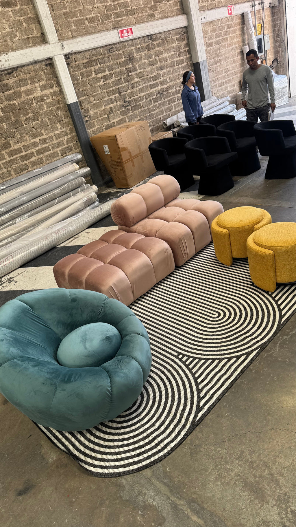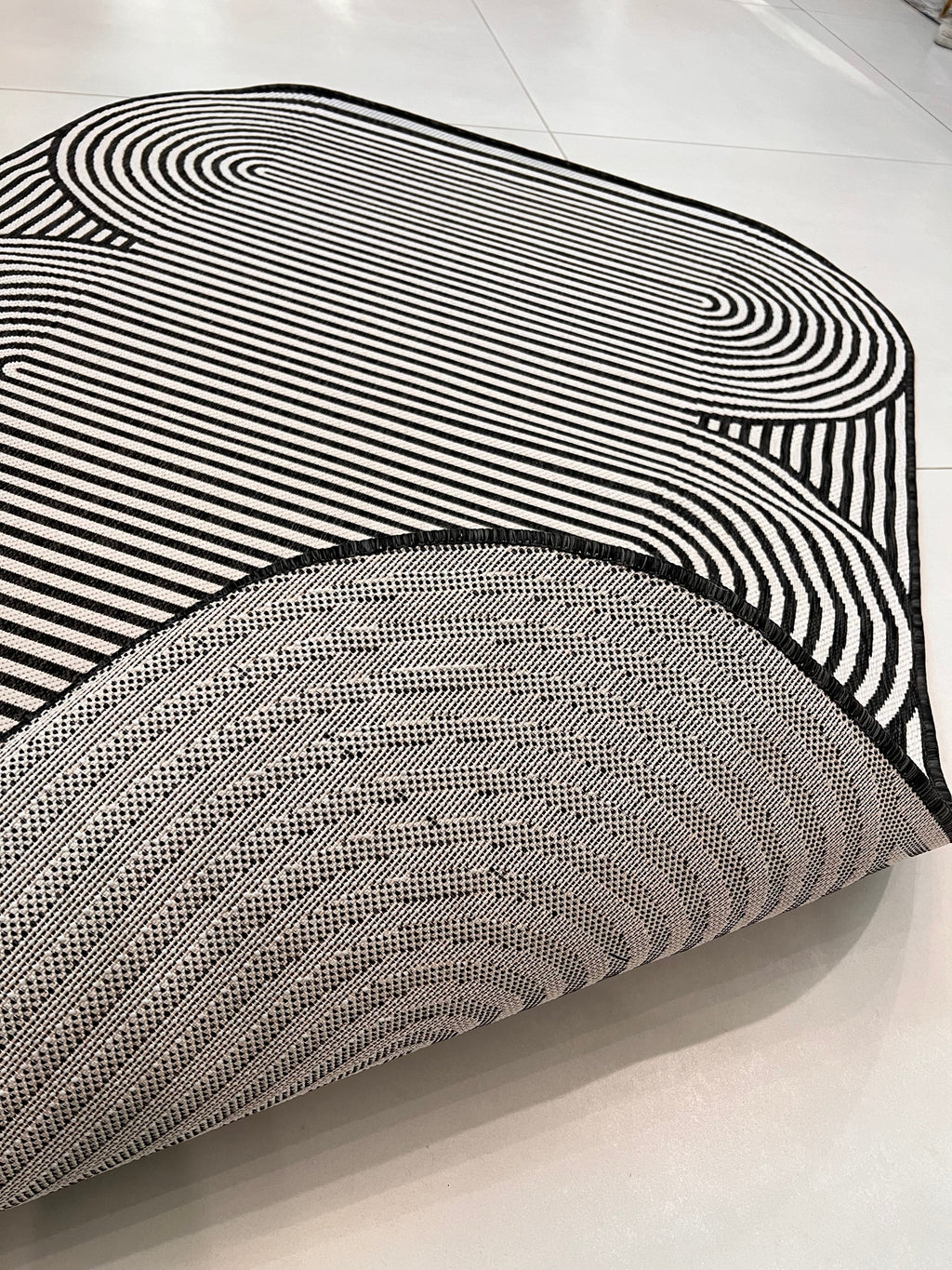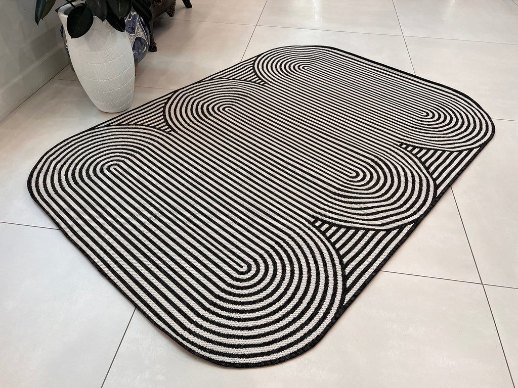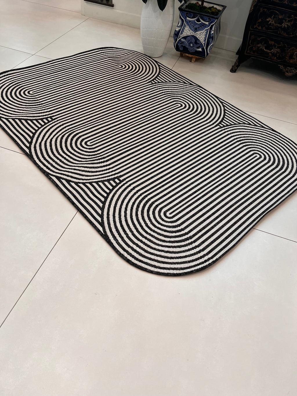 Black & Ivory Geometric Indoor/Outdoor Rug with Organic Live Edge.