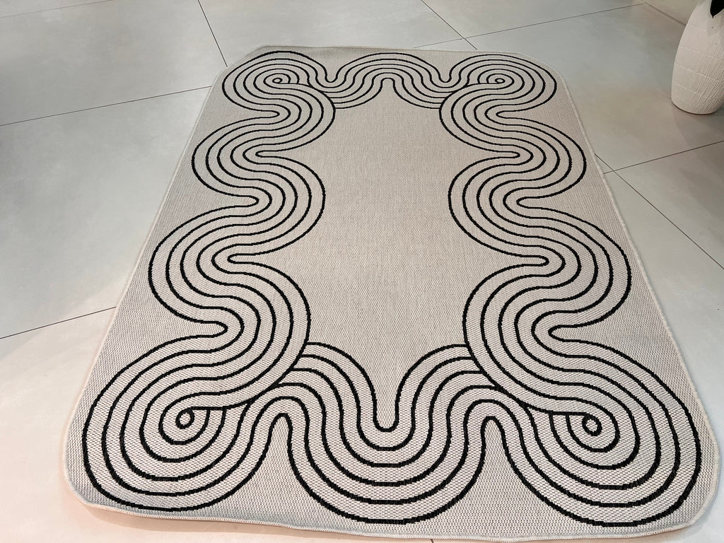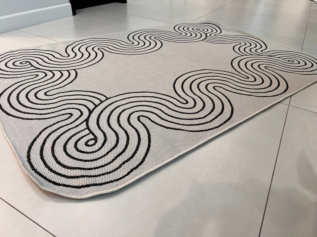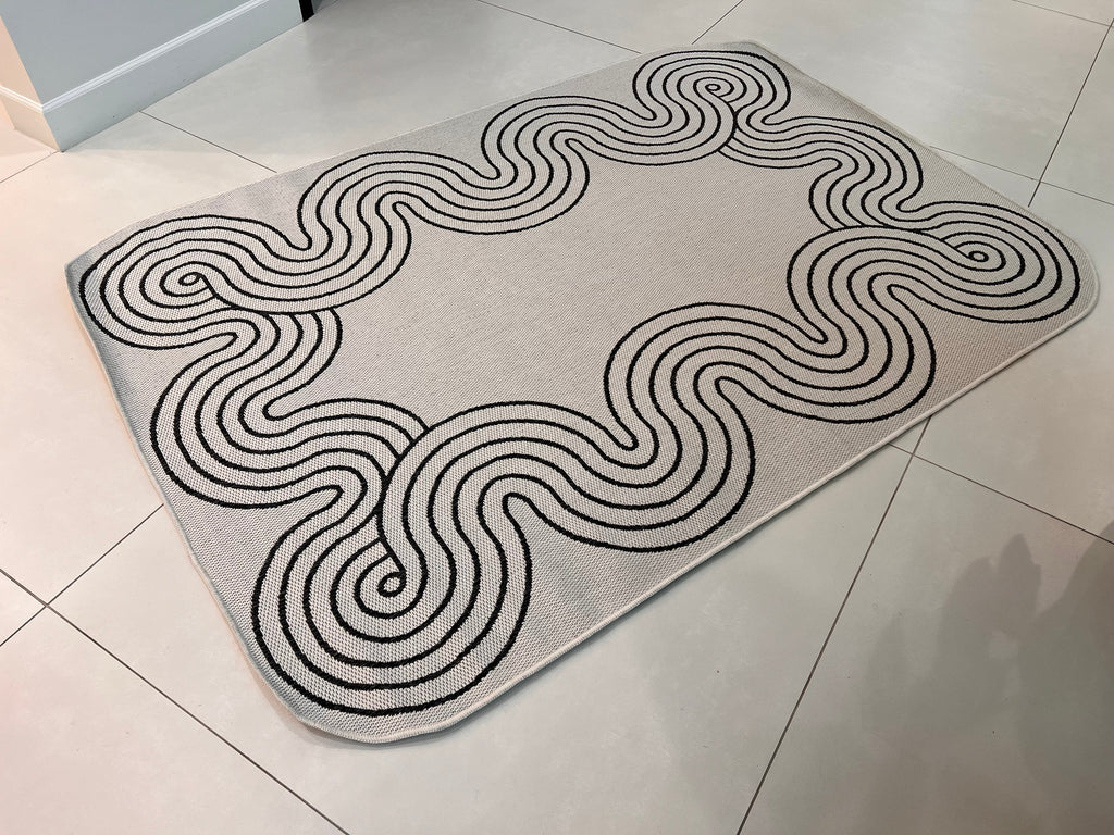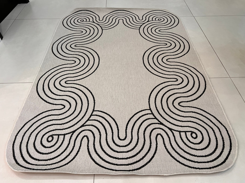 Indoor/Outdoor Ivory Rug with Black Geometric Swirl and Live Edge Design.