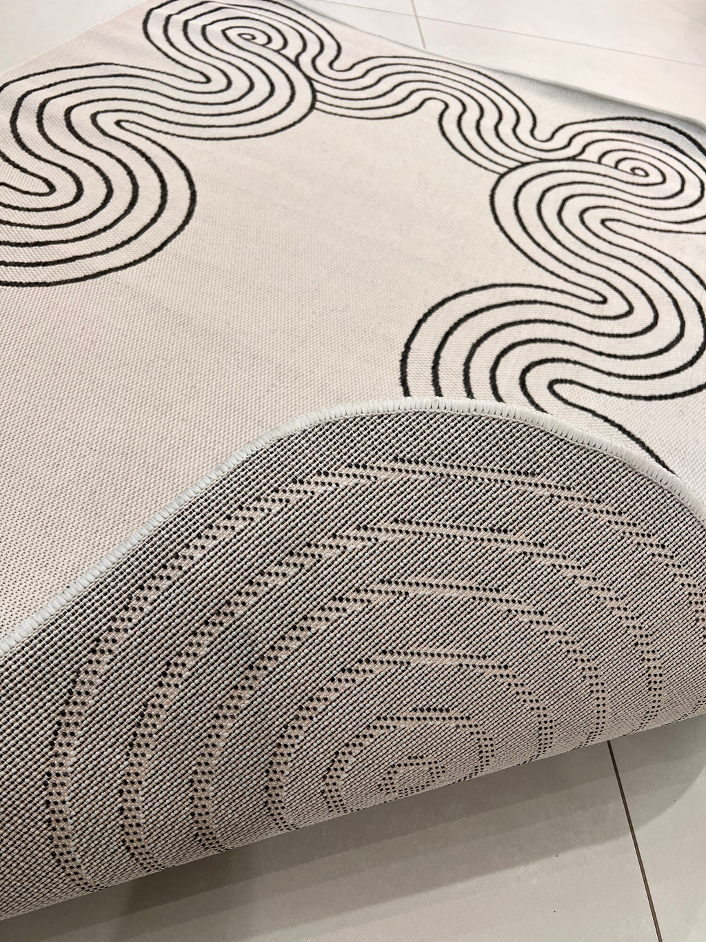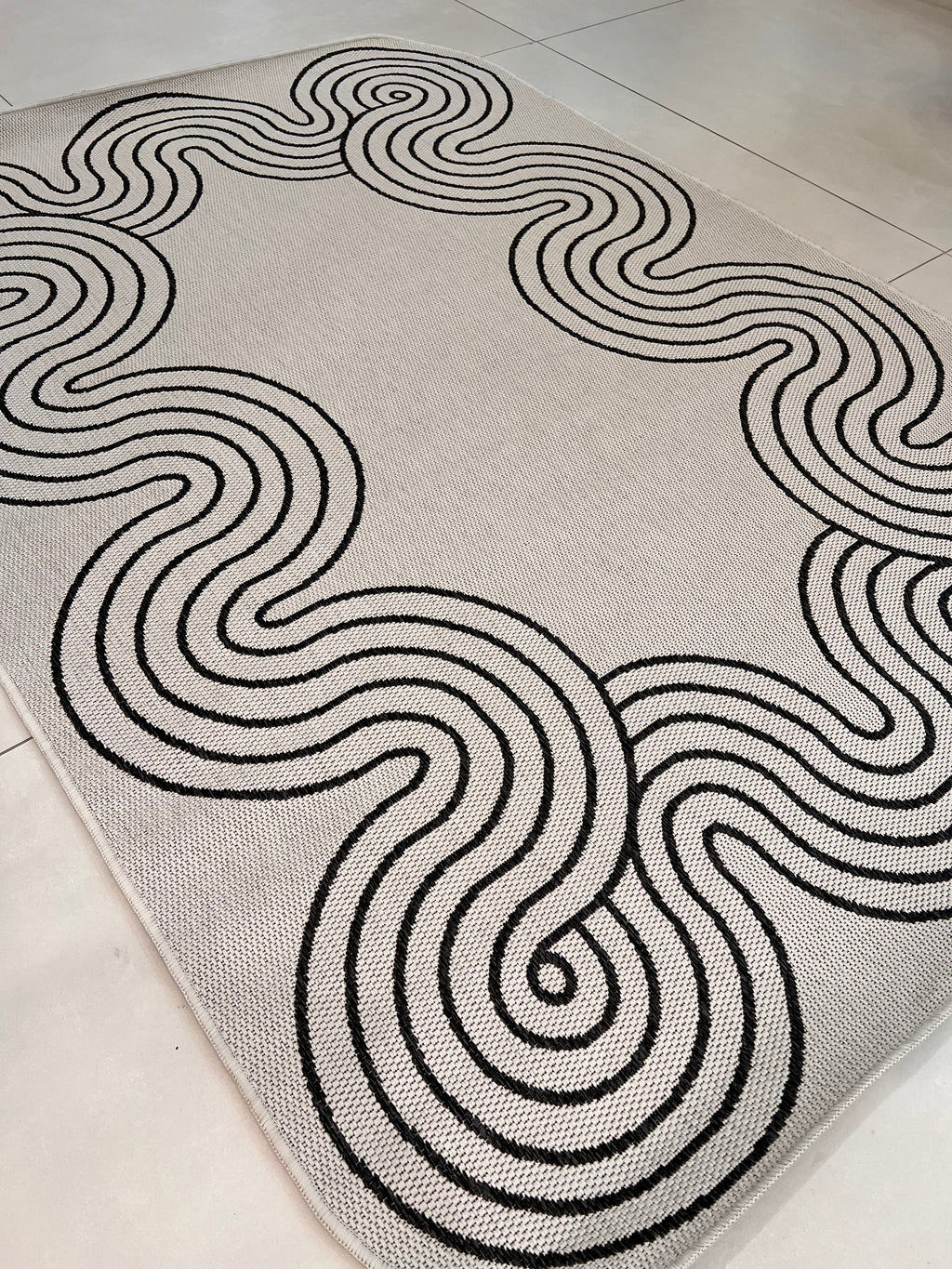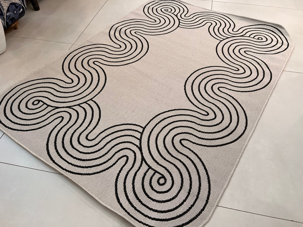 Indoor/Outdoor Ivory Rug with Black Geometric Swirl and Live Edge Design.