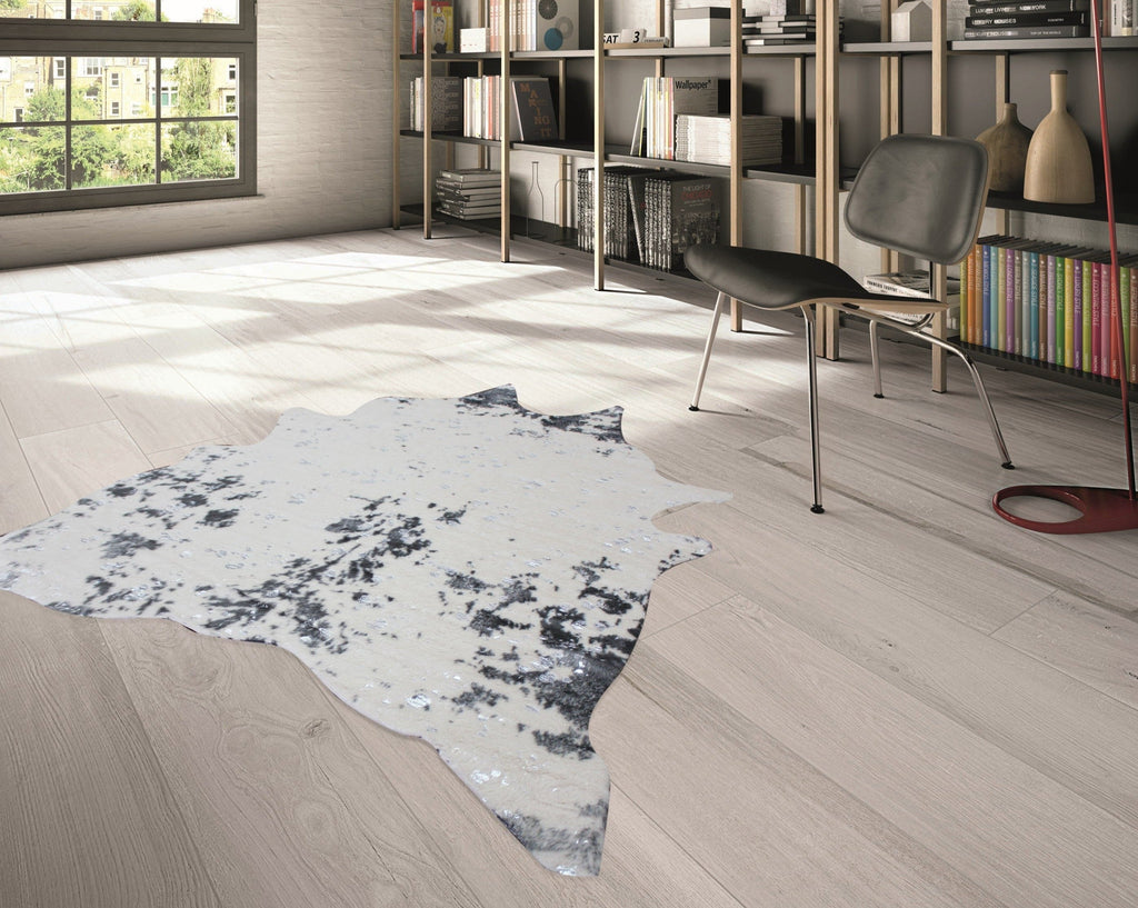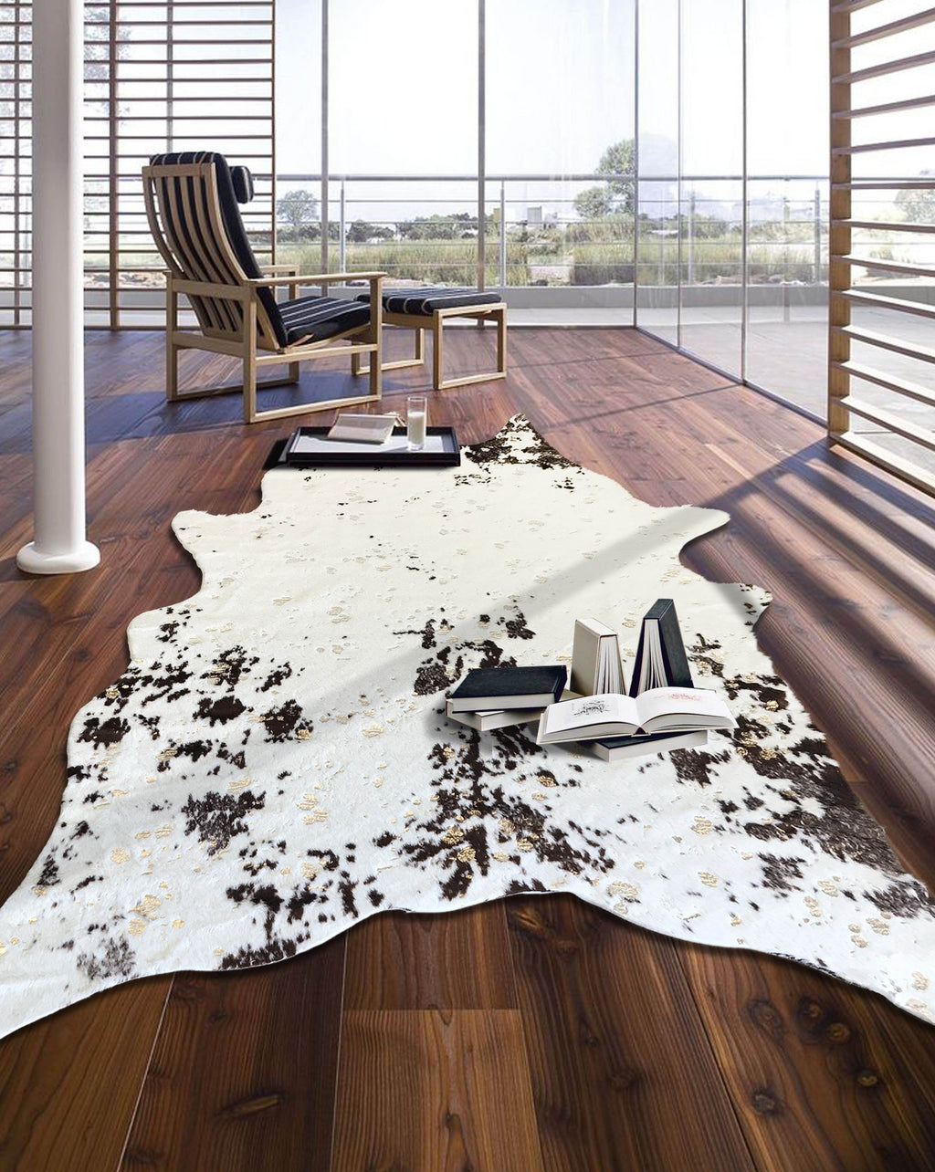Interior design Cowhide animal cruelty free inspired in patchwork rug anchors, an elegant classic and metallic shine touch to spark glow any space in your house, bedroom, living room, bedroom, den, home office/ study or other decorative space.