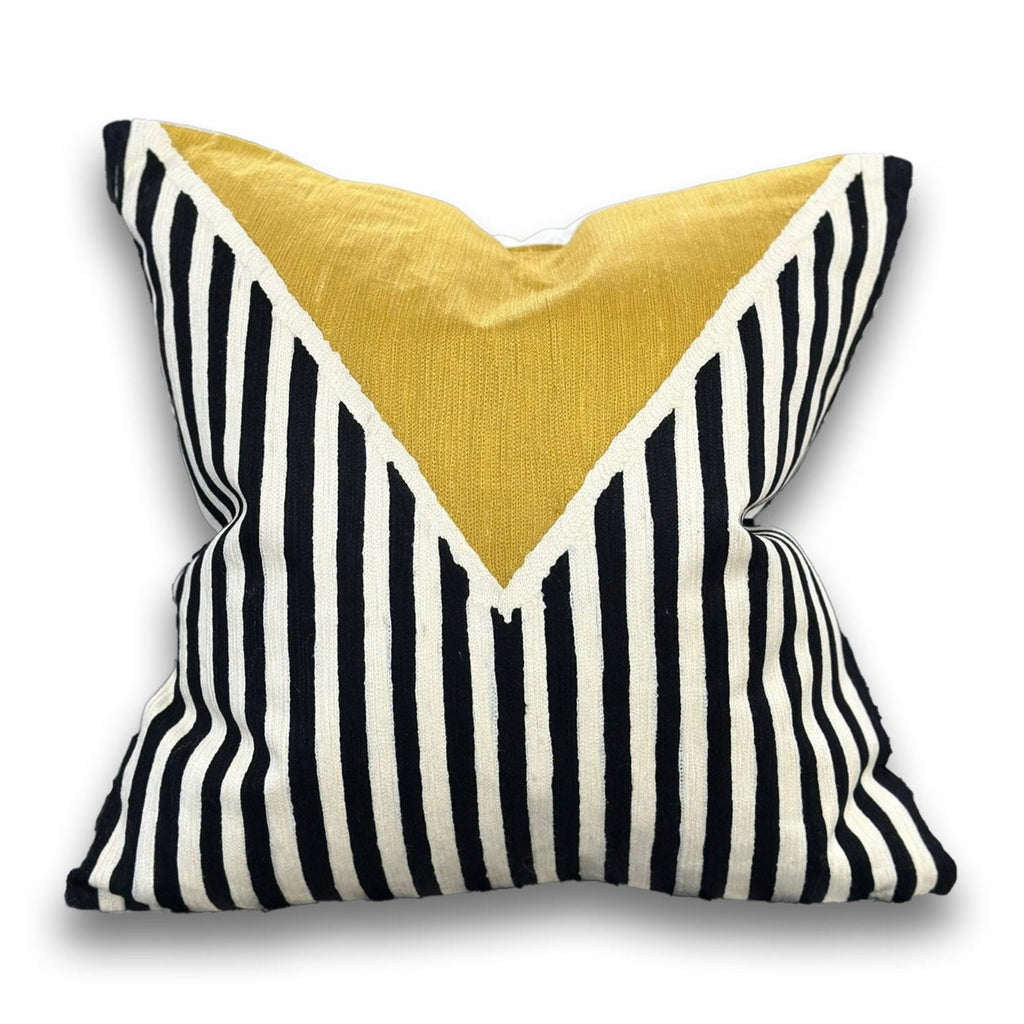 White Base Decorative Throw Pillow with Black & Ivory Geometric Embroidery and Mustard Graphic - VIVA012.